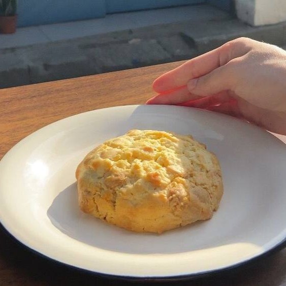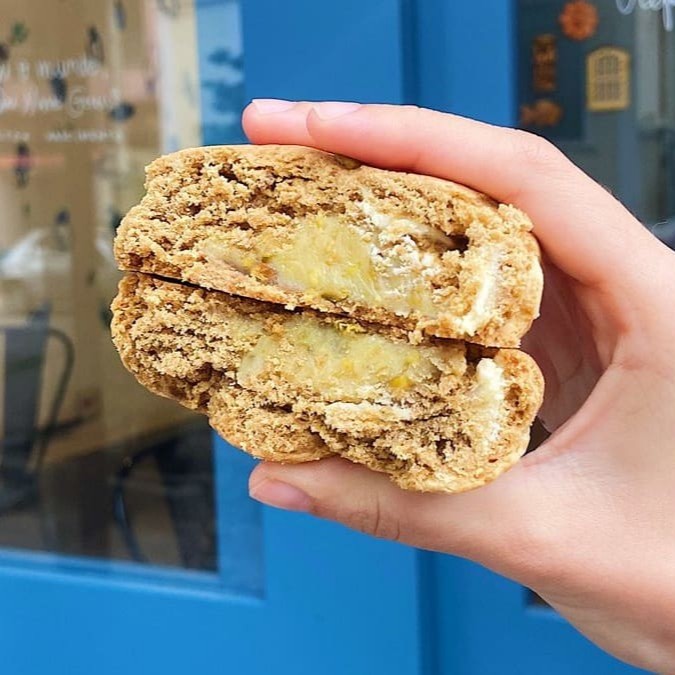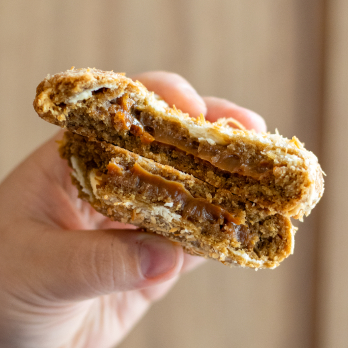 Cookie com gotas de chocolate branco com recheio de doce de leite e coco em volta.