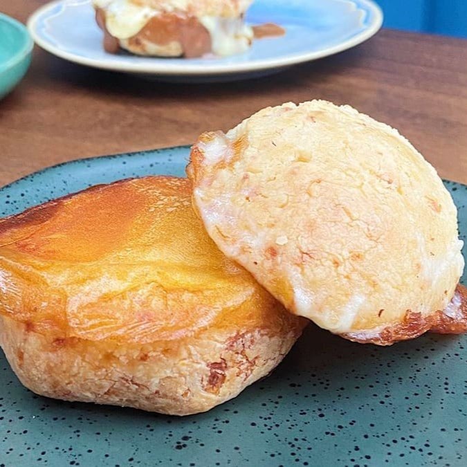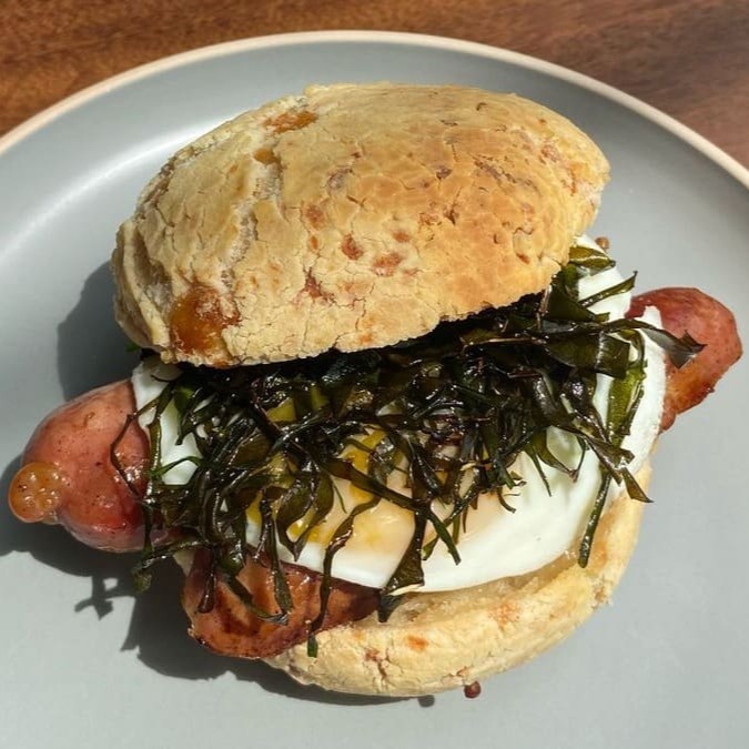 Pão de queijo recheado com linguiça de pernil, ovo e couve crisp
