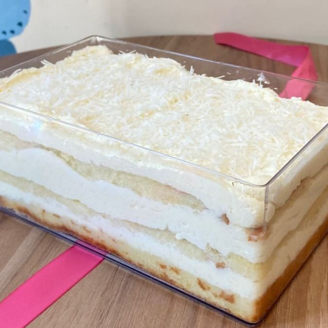 Nosso bolo de coco bem molhadinho, recheado de mousse de coco. Em média 1.300kg serve 4 pessoas.