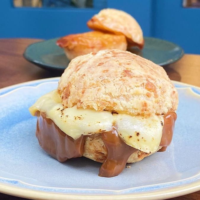 Sanduíche de pão de queijo purin com um clássico mineiro: doce de leite e queijo canastra
