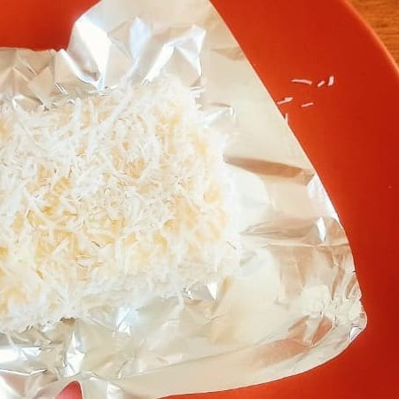 Bolo de coco embrulhado no papel alumínio. Recheadinho com mousse de coco, e molhado com calda de leite de coco e Leite Moça. Sabor de infância