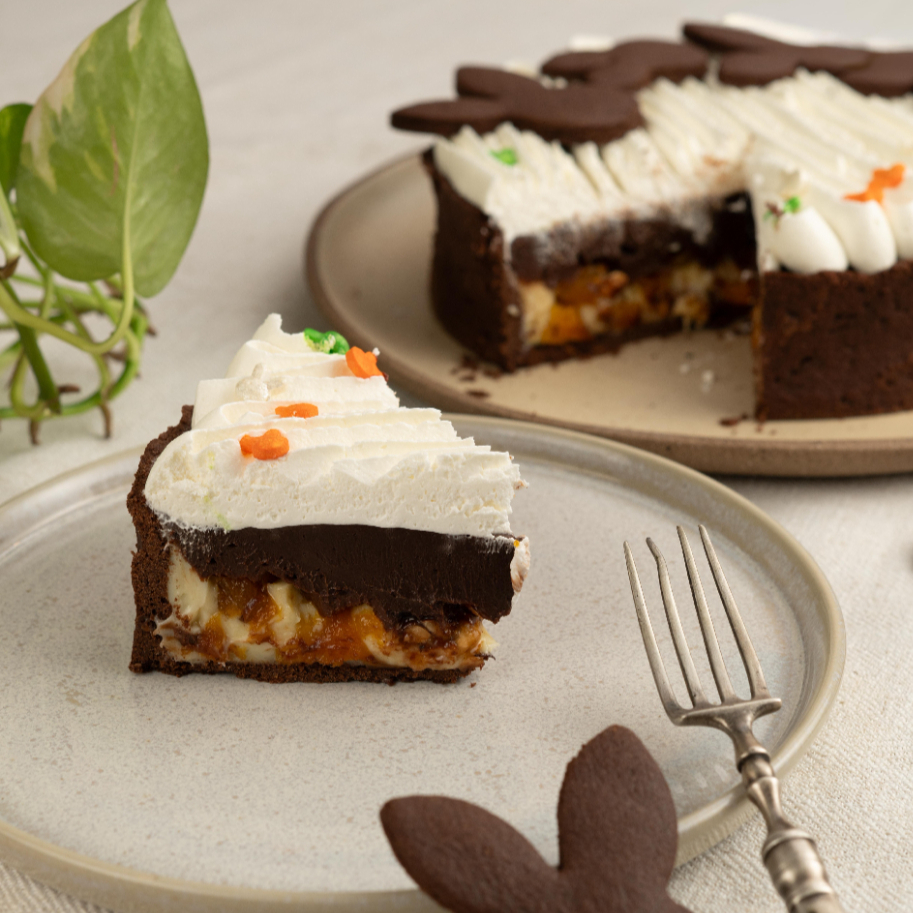 Torta com massa amanteigada de chocolate, duo de ganaches branca e meio amarga com pralinê de avelãs e compota de damasco. Cobertura de Chantilly