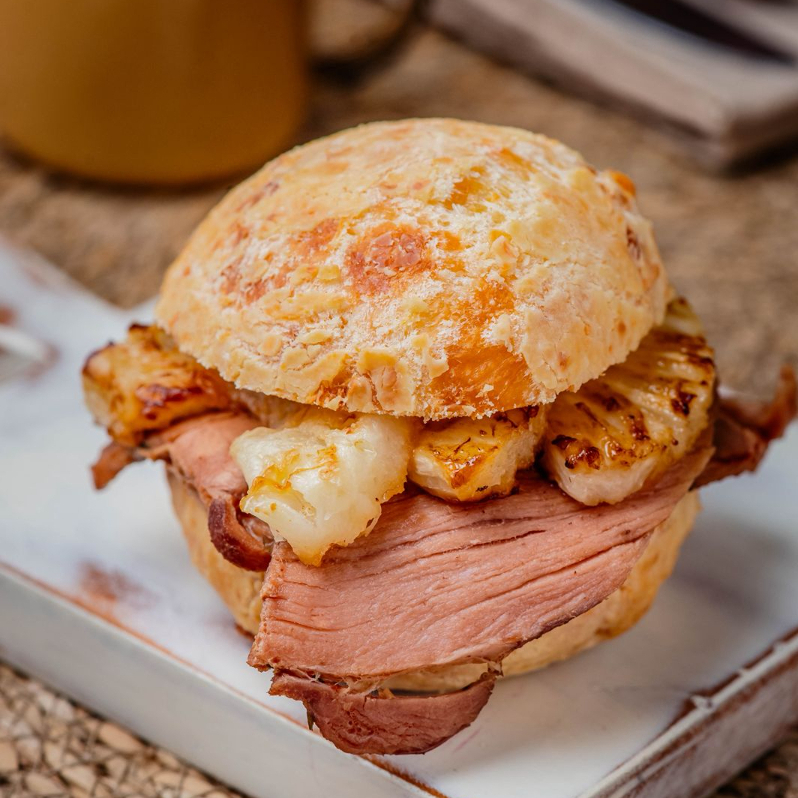 Sanduíche de pão de queijo com pernil assado e abacaxi