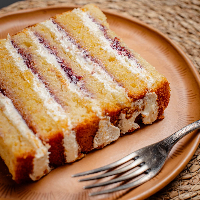 Bolo de baunilha com recheio de creme de confeiteiro aerado com limão siciliano e geleia de frutas vermelhas