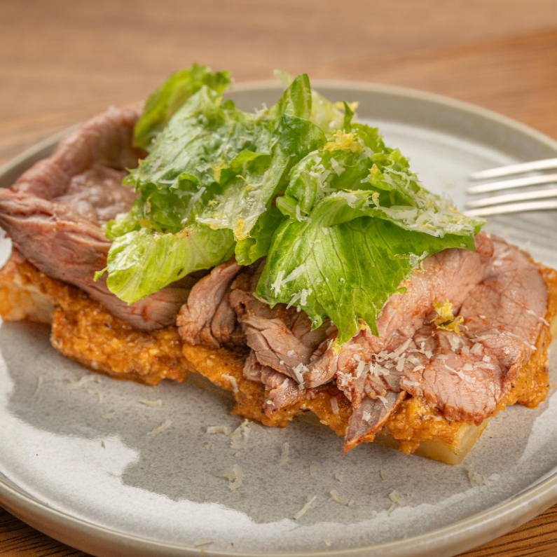 Torrada de pão de queijo com molho Romesco (pimentão defumado), rosbife, mix de folhas, raspas de limão e parmesão fresco