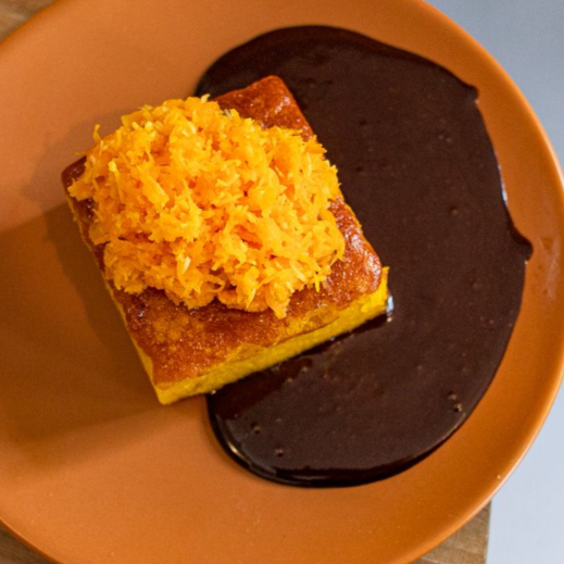 Bolo de cenoura, cocada de cenoura e calda de chocolate meio amargo