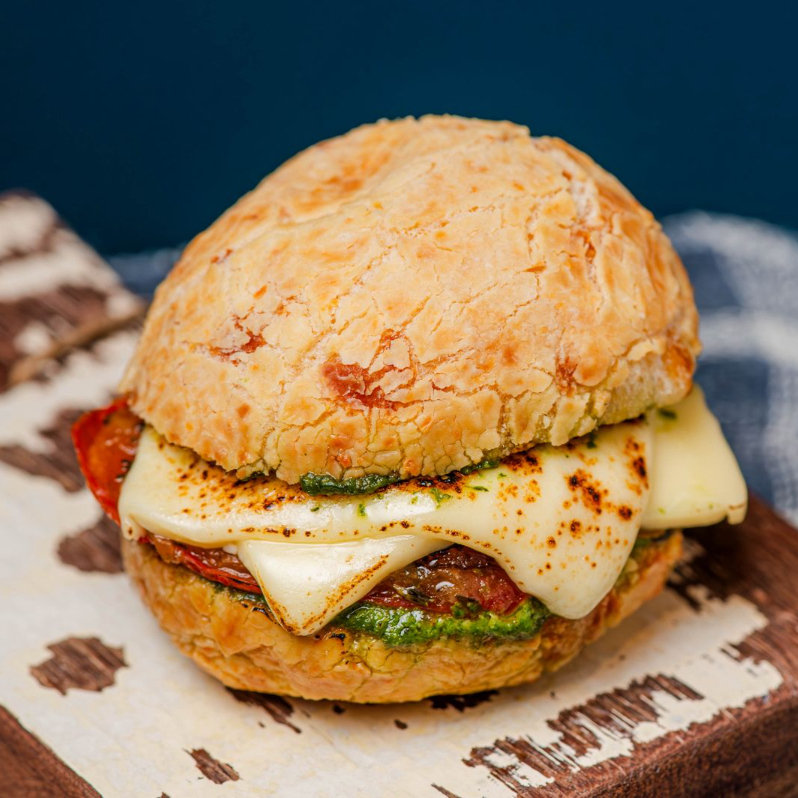 Sanduíche de pão de queijo feito com queijos mineiros. Recheio de tomate assado com molho pesto e queijo da canastra