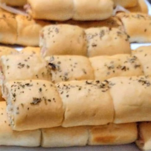 Bandeja com mini italiano de queijo e presunto congelados, só aquecer no forno.