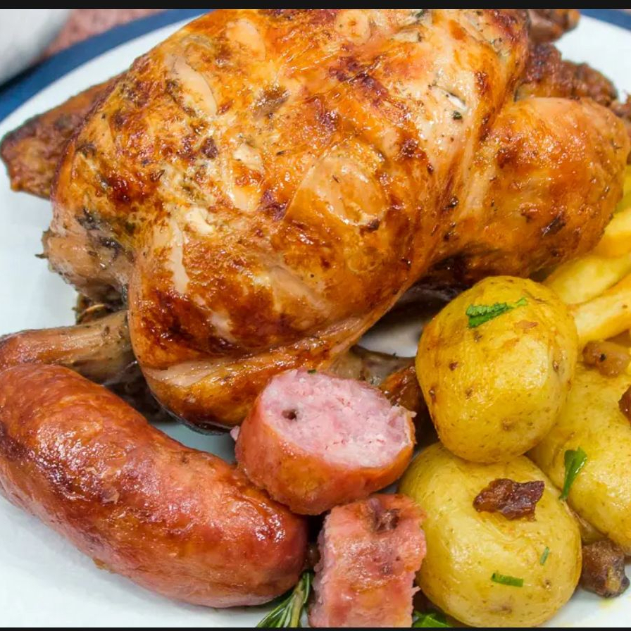 Combo: 1 Galeto Assado + 500 g Batata Assada + 1 porção de farofa da casa + 2 Linguiças