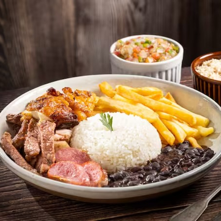 Frango, Farofa, Batata Calabresa, Arroz, Molho, Vinagrete E Refrigerante