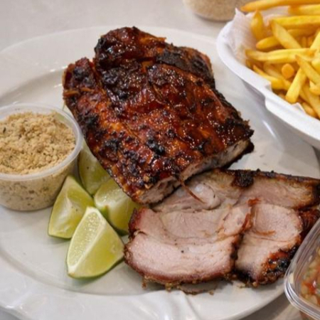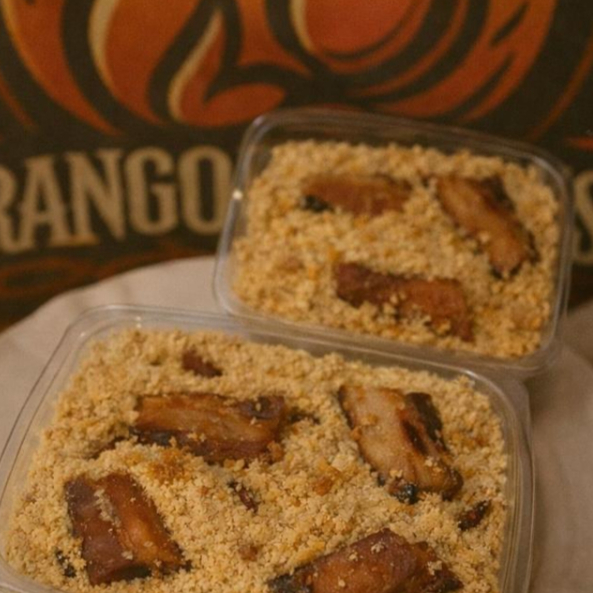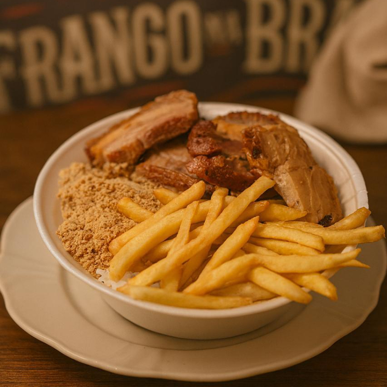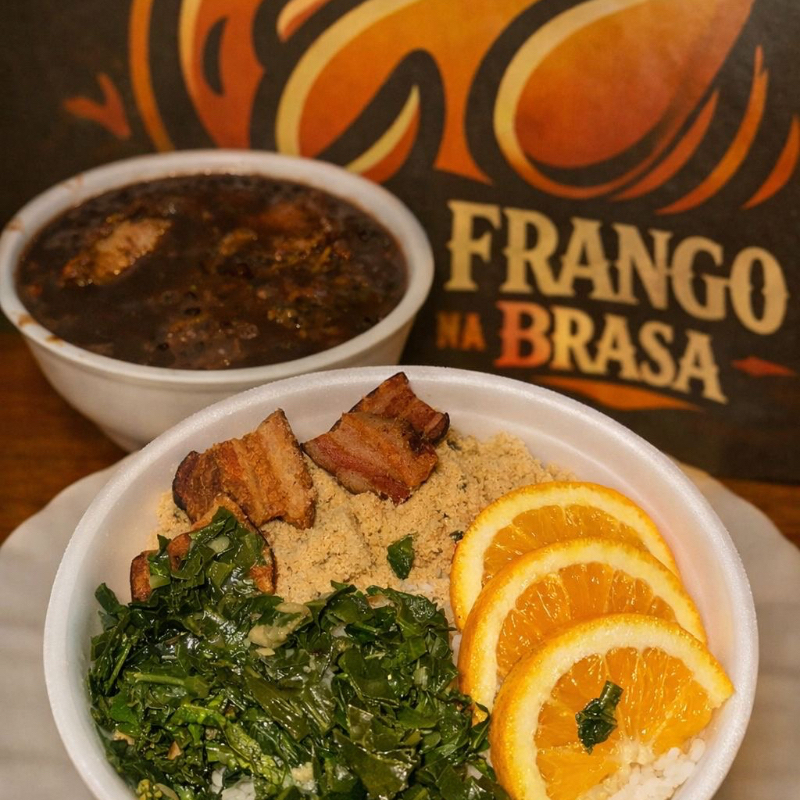 Acompanha Arroz, Farofa, Couve, Torresmo de Bacon e Laranja