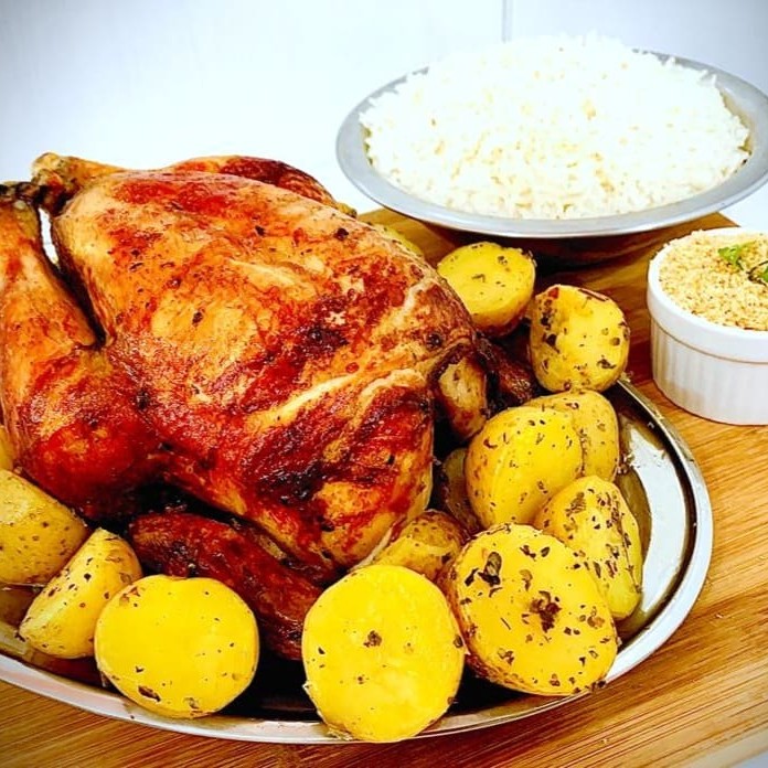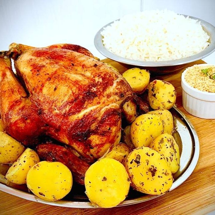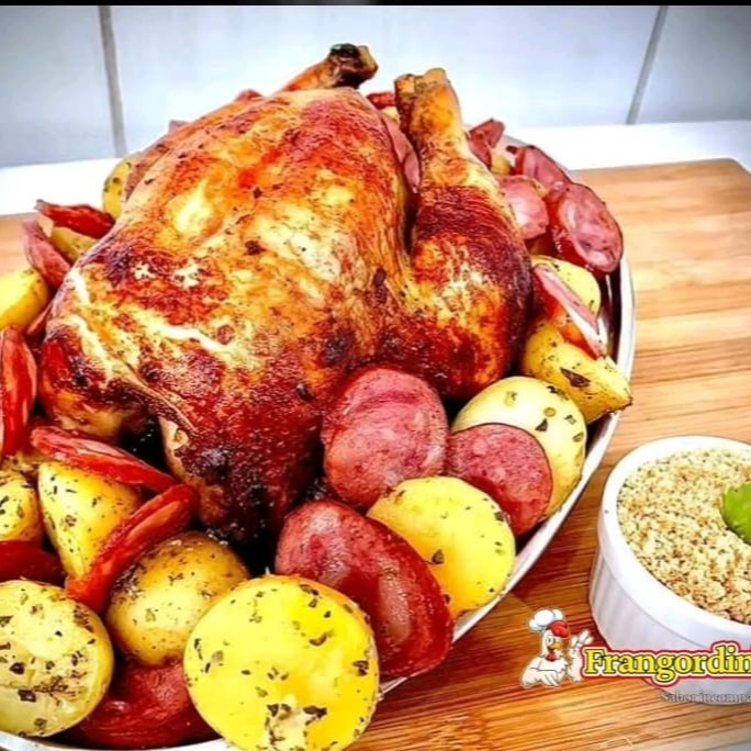 Delicioso frango assado com farofa, batatinha calabresa