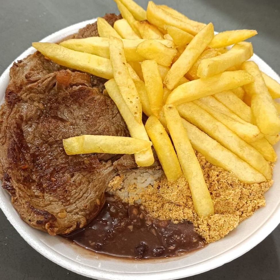 Quentinha Bife de Alcatra Acebolado com Fritas, arroz, feijão, farofa