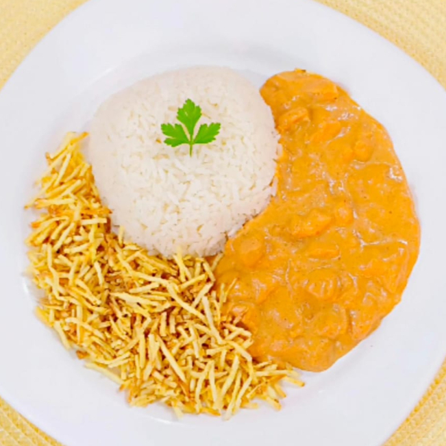 Strogonofe de Frango e molho cremoso, servido com arroz e batata palha crocante.