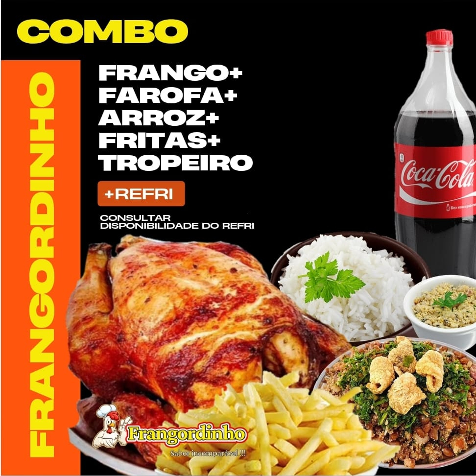 Apresentamos a você nosso 'Combo Frangordinho', uma seleção primorosa da categoria 'Nossos Combos'. Este prato é composto por um delicioso frango assado, dourado à perfeição, que se desmancha na boca. Acompanha uma farofa crocante e saborosa, arroz fresquinho e um feijão tropeiro autêntico, repleto de sabor e tradição. Inclui ainda fritas crocantes e douradas, servidas bem quentinhas. Para complet