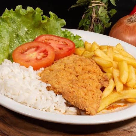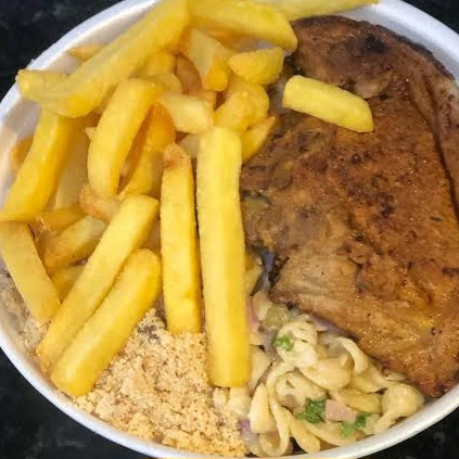 Arroz, feijao, farofa, salada legumes ou maionese, fritas ou pure