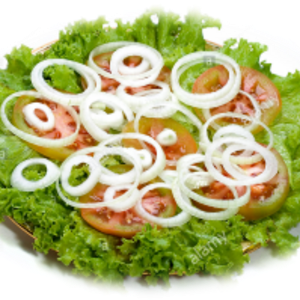 Alface crespa, tomate, cebola em rodelas finas