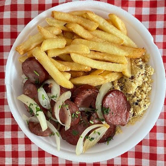 2 bifes, 2 pedaços de linguiças,arroz, farofa, molho a campanha, salada legumes ou maionese, fritas ou purê, feijão