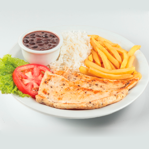 Arroz, feijão, farofa, salada legumes ou maionese, fritas ou purê