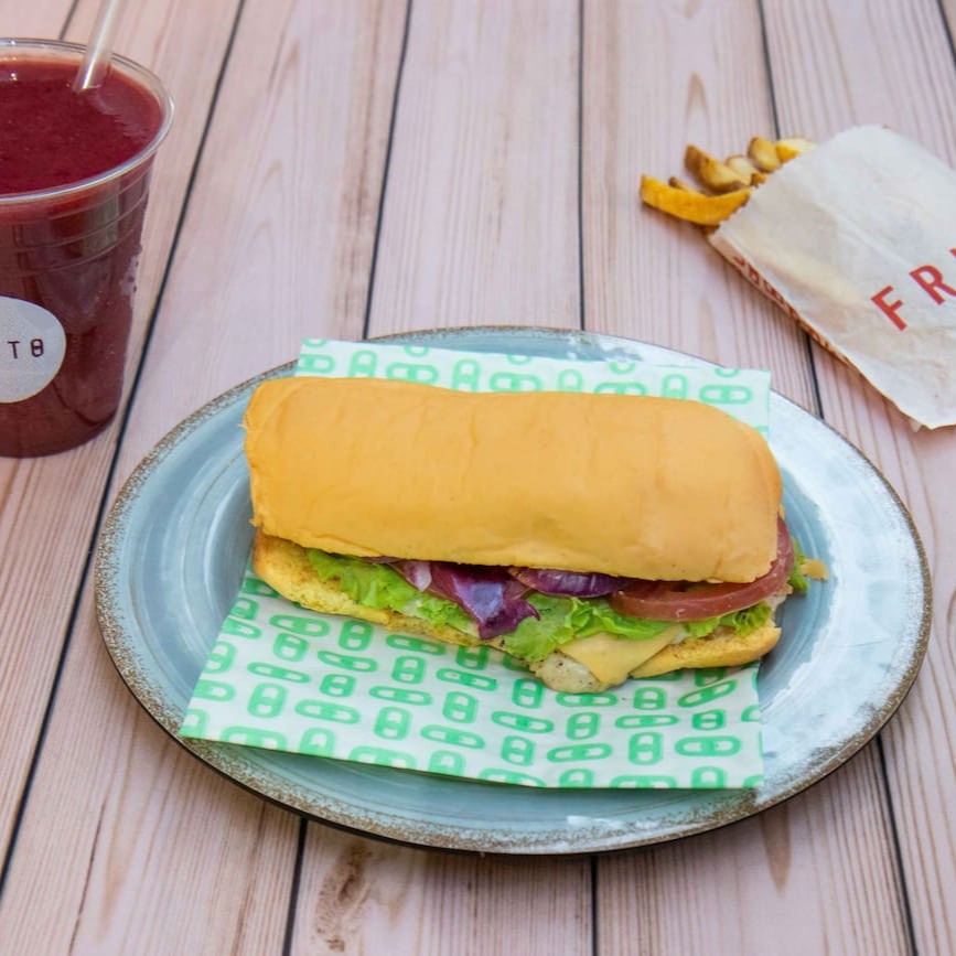 Pão especial exclusivo do fruto + filé de frango + queijo + salada + cebola roxa + molho especial