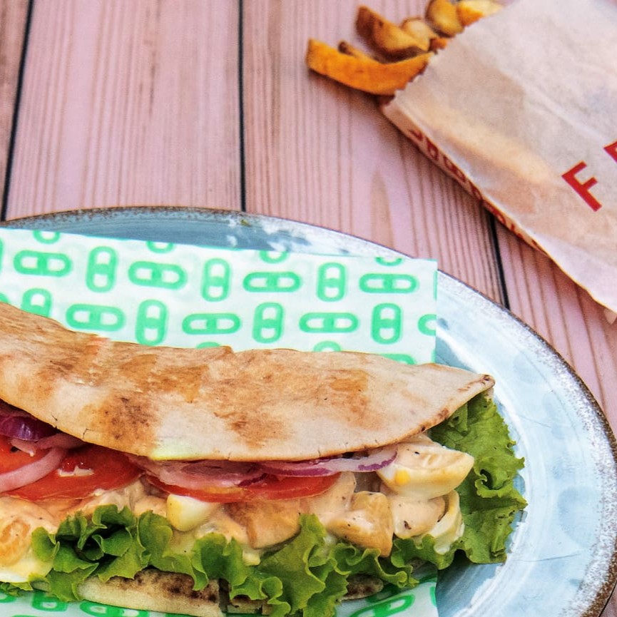 Pão árabe, uma deliciosa pasta com frango grelhado em cubos, ovos de codorna e alho-poró; salada: alface, tomate ,cebola-roxa e molho especial.