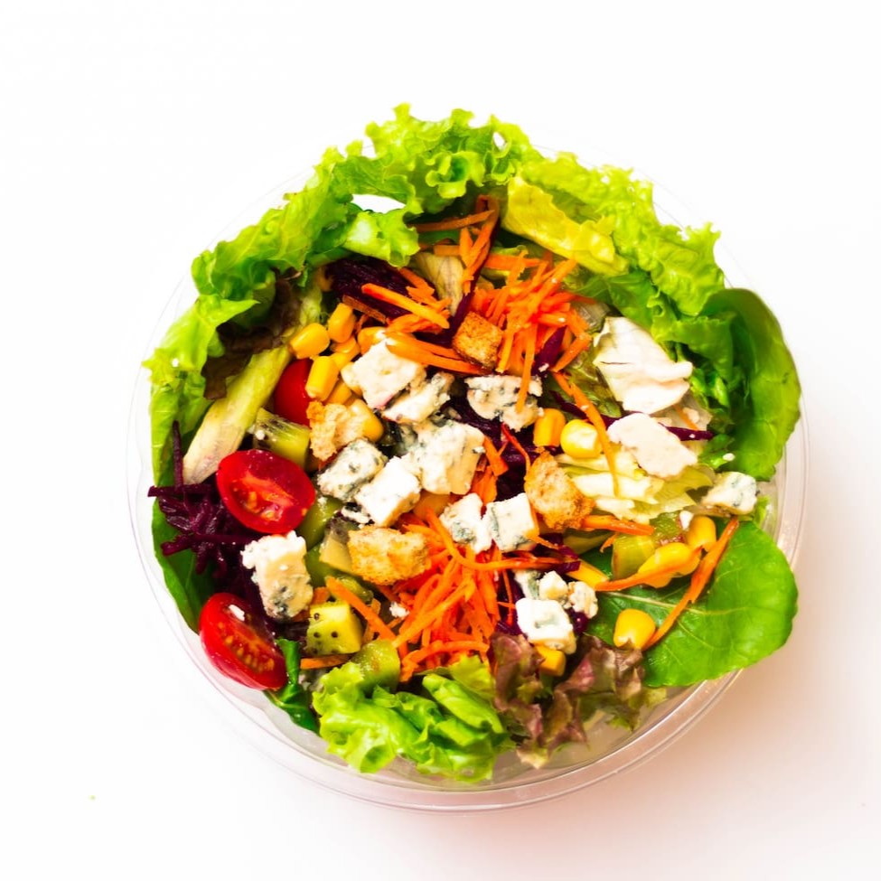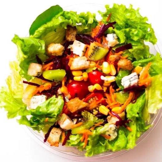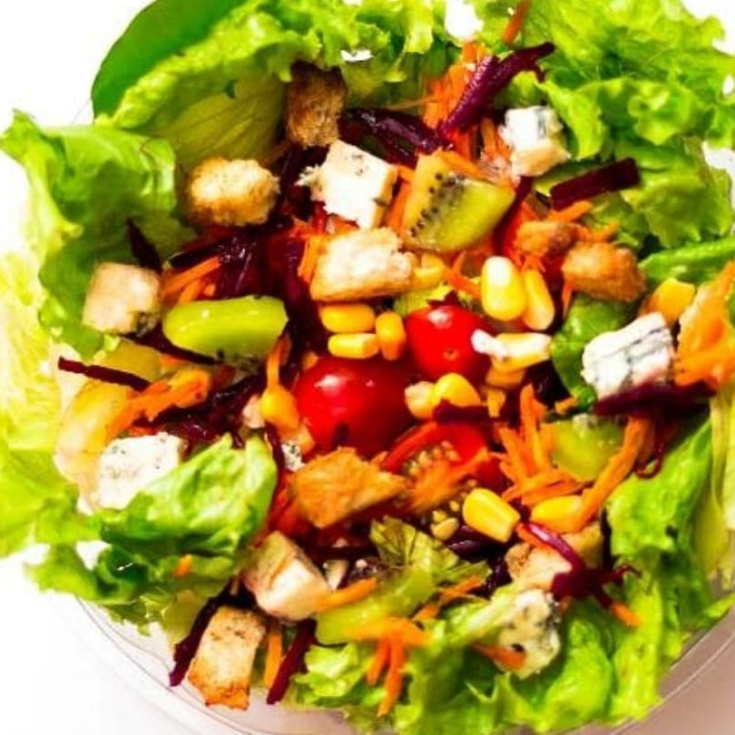 Mix de folhas, cenoura, beterraba, tomate cereja, gorgonzola, milho, croutons.