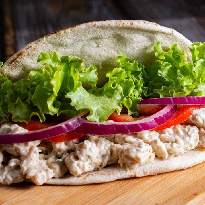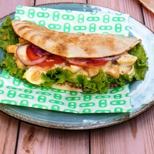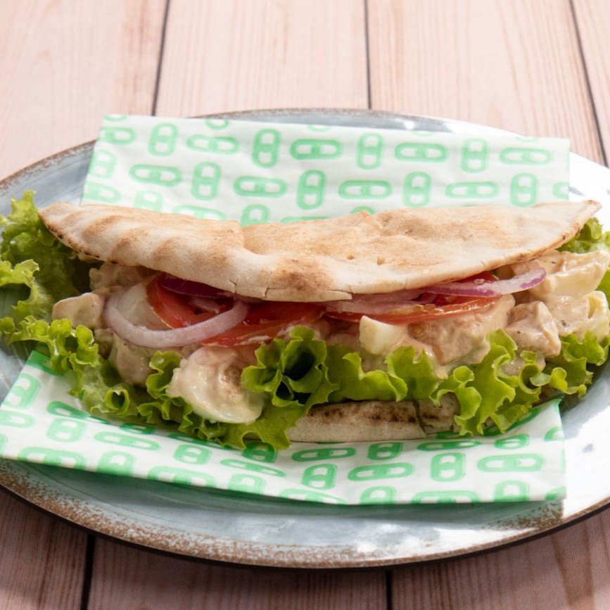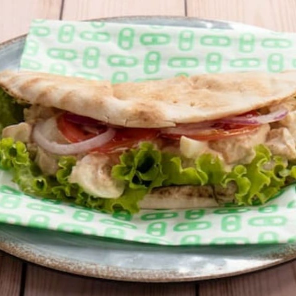 Pão árabe, frango grelhado em cubos com maionese e alho poró, alface, tomate, cebola roxa e molho branco.