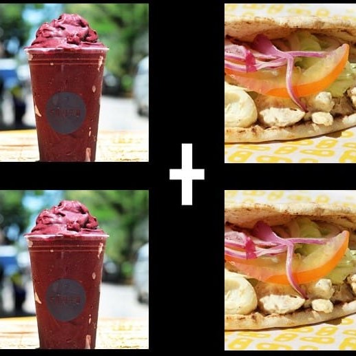 Pão árabe, uma deliciosa pasta com frango grelhado em cubos com ovos de codorna e alho-poró; salada: alface, tomate ,cebola roxa e molho especial +nosso açaí premium 300ml