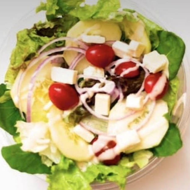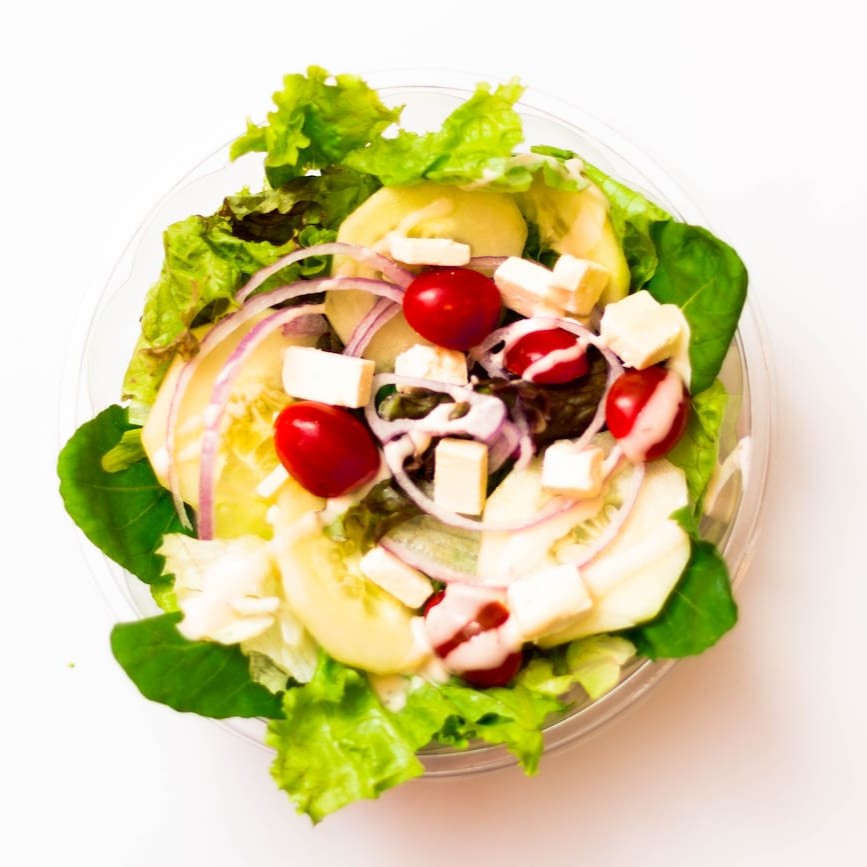 Pepino, cebola roxa, tomate cereja, queijo branco, e molho a escolher.