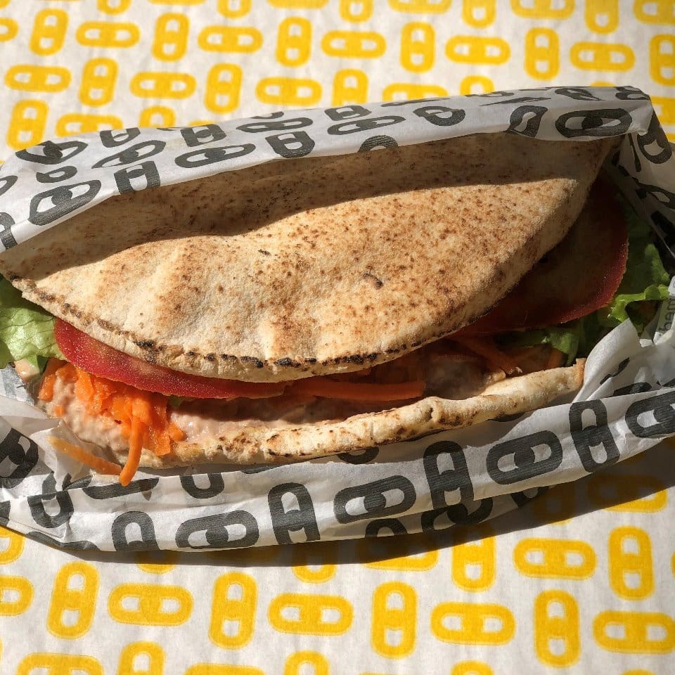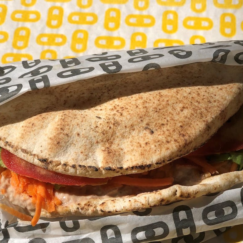 Pão árabe, pasta de atum com cebola roxa, alface, tomate e cenoura.
