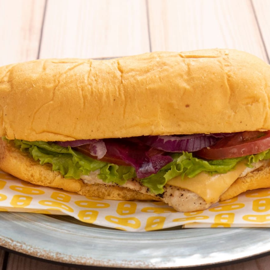 Pão especial, filé de frango, queijo, alface, tomate,cebola roxa e molho especial