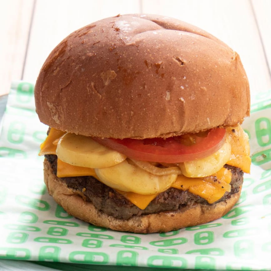 Pão de cacau,aproximadamente 120g blend de carne, cogumelo, cebola caramelizada, tomate, muito queijo cheddar, molho de mostarda e mel + shoyo.