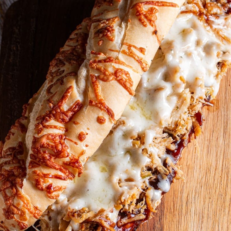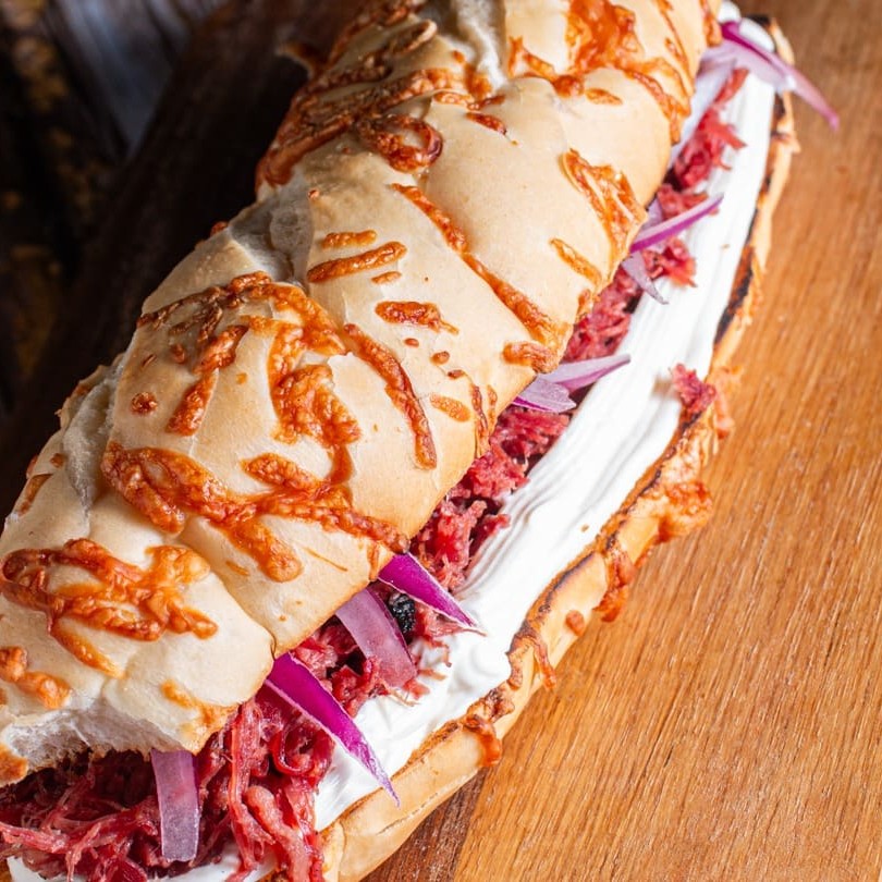 Pão artesanal, costela bovina desfiada, queijo mussarela e molho Bbq.