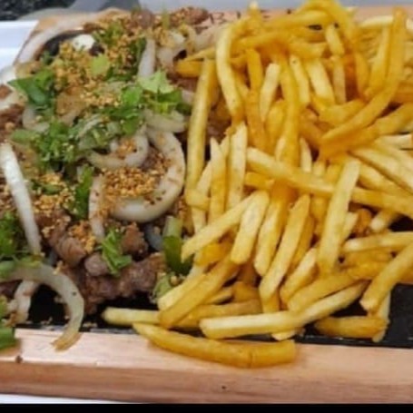 Contra filé,cebola,batata frita