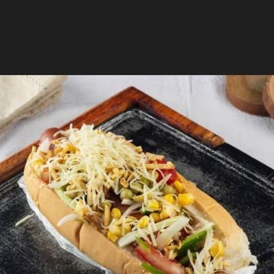 Cachorro quente salsicha, tomate,cebola, maionese, ketchup,milho, ervilha,batata palha, queijo parmesão