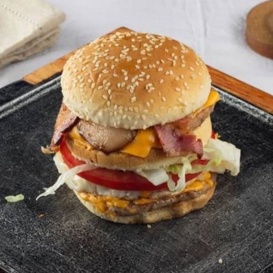 2 carne sabor picanha 120 gramas cada , bacon fatiado , ovo, cheda processador, molho, salada