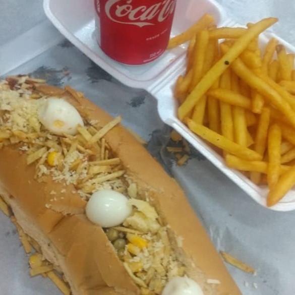 1 cachorro quente salsicha ou linguiça,mini batata frita,uma coca cola 310 ml , milho,ervilha maionese,ketchup,batata palha,queijo parmesão