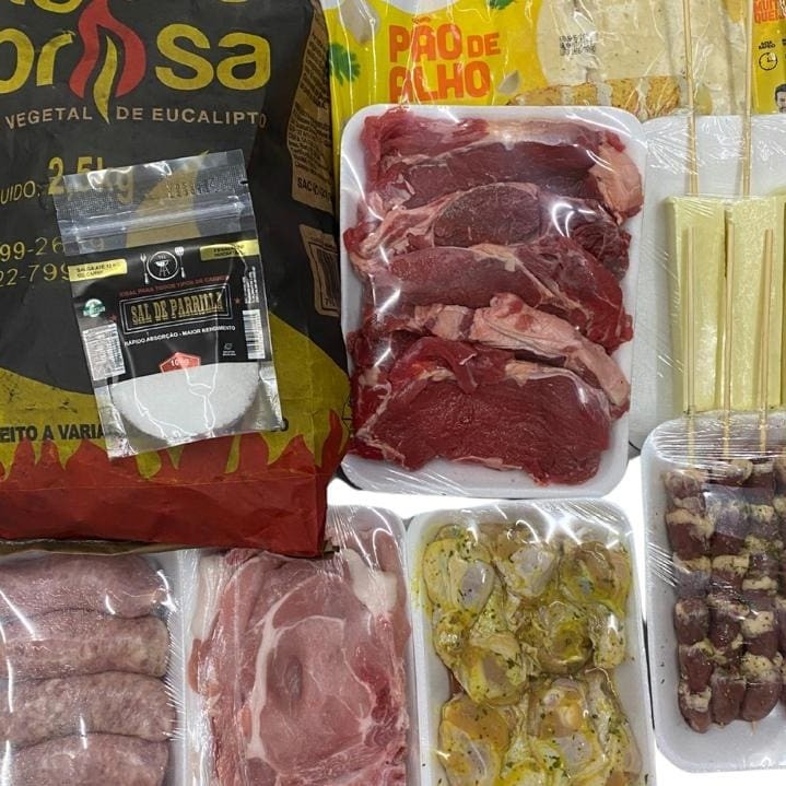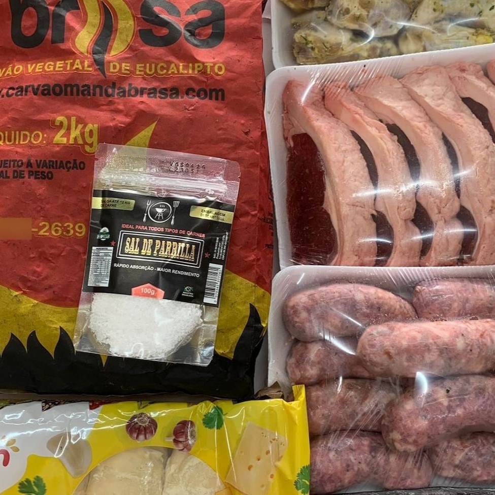 1 kg Contra filé grill 500g Linguiça suína 500g Carré 500g Drumet 3 espetos queijo coalho 5 espetos coração de frango 1 Pão de alho 1 carvão 2,5kg *pesos aproximados copm variação +ou -