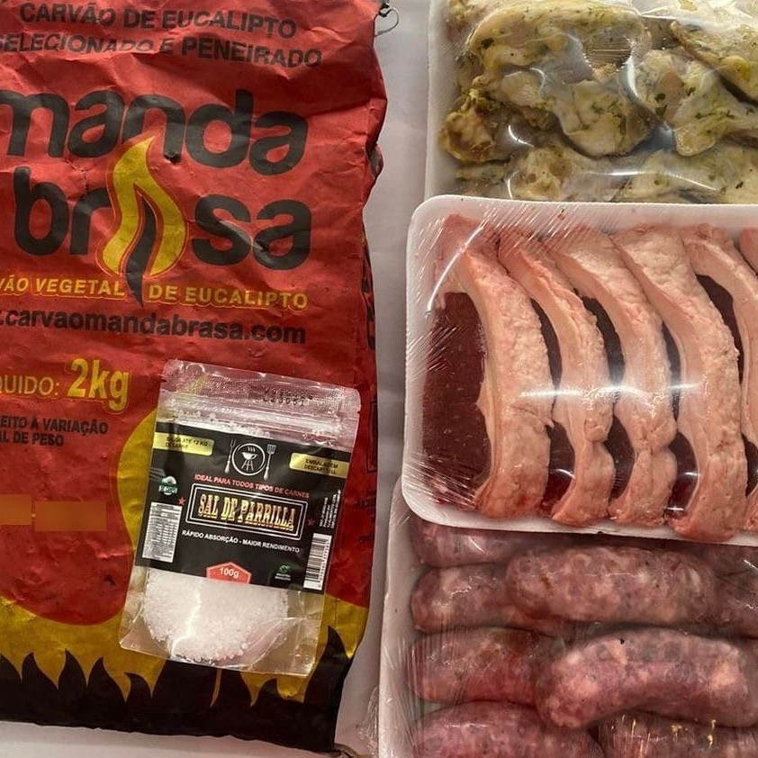 1 kg Contra filé grill 1kg linguiça suina 1 kg drumet 1 carvão 2 kg
