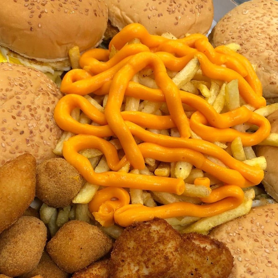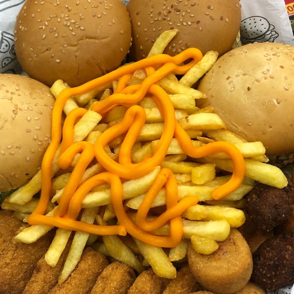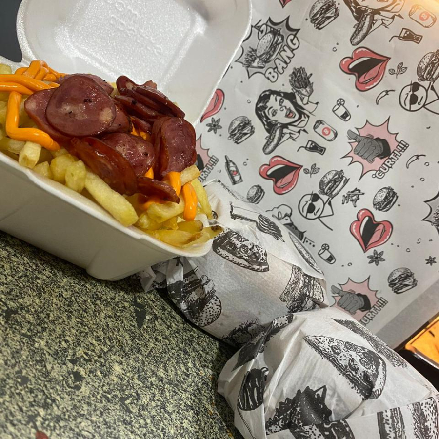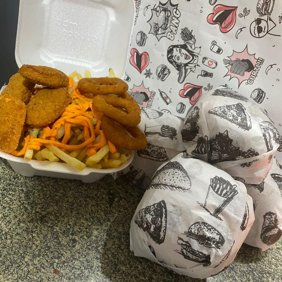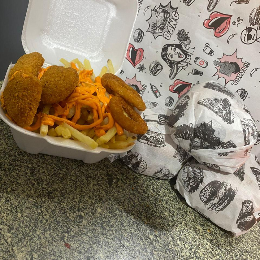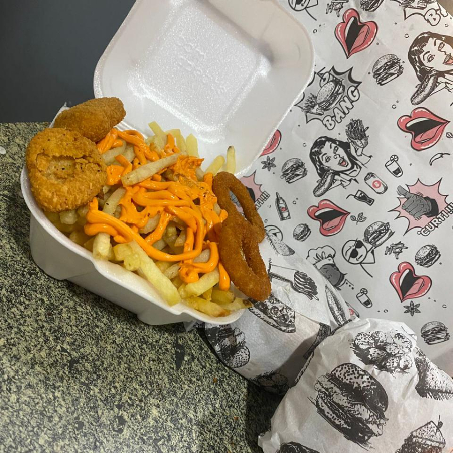5x-Egg ( Pão, carne, queijo, alface, molho ( ketchup, maionese), batata frita c cheddar, salgadinho e Nuggets Caixa 35cm
