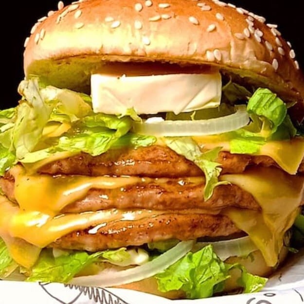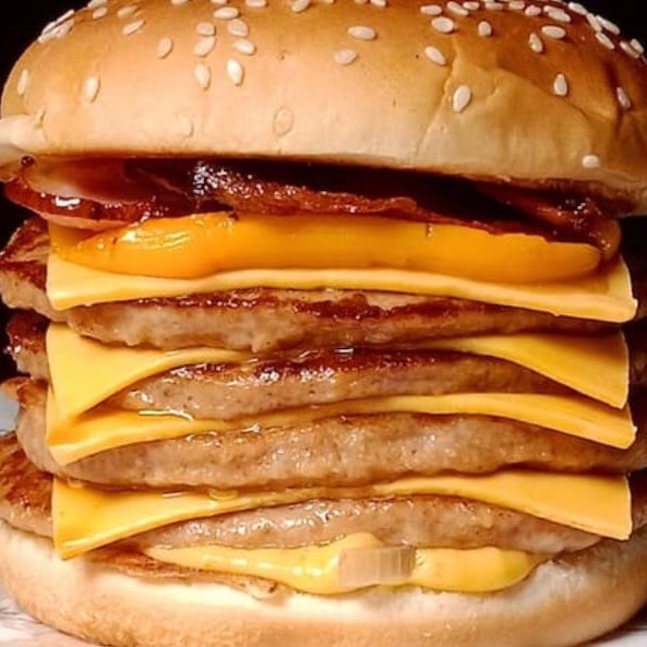 Pão, 4 carne, 2 queijo cheddar, cheddar cremoso e bacon