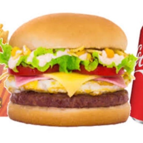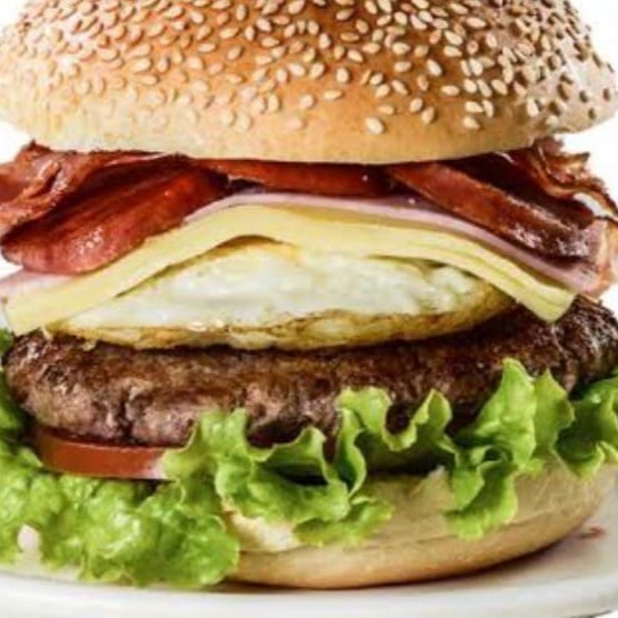 Pão, carne, queijo, ovo, presunto, calabresa, bacon, alface, molhos e batata palha. Batata frita e coca lata