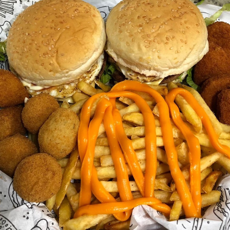 2 X-Egg (Pão, carne, queijo, alface, molho(ketchup, maionese) batata frita c cheddar, salgadinho e Nuggets Caixa 25cm