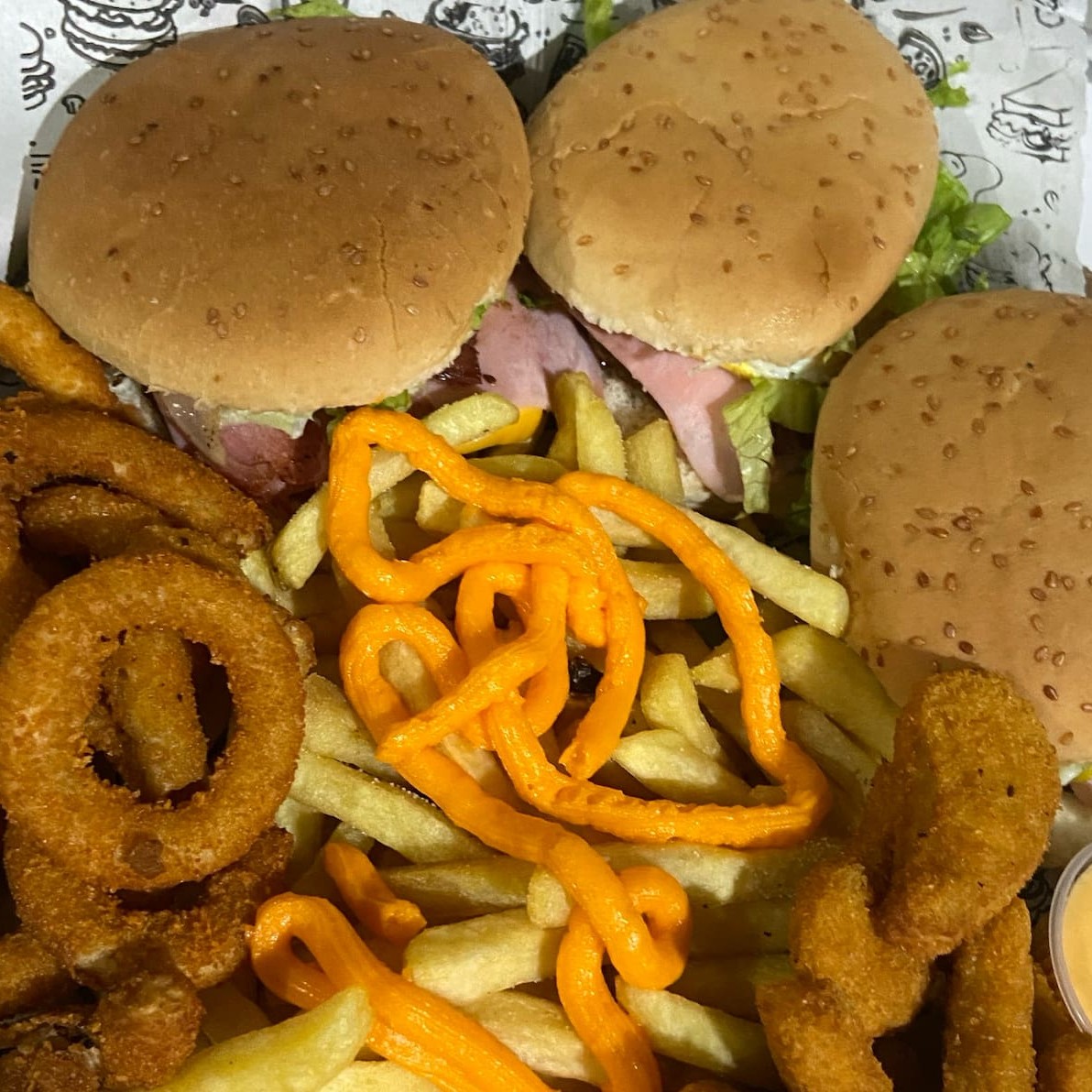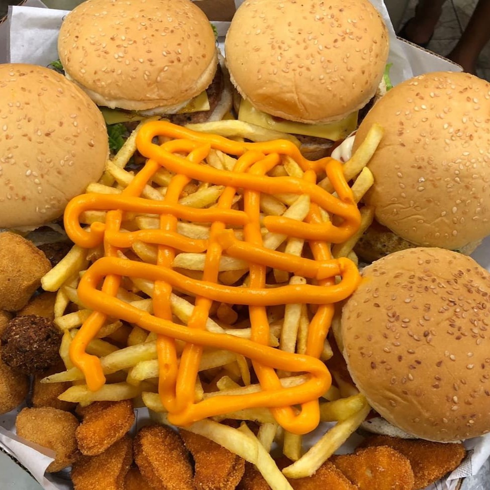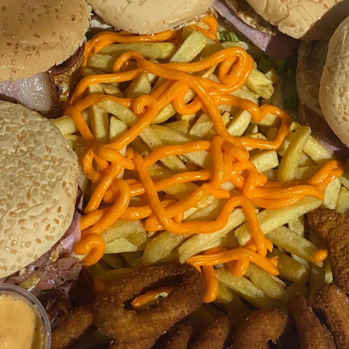 4x-tudo (Pão, carne ,queijo ,ovo, queijo, presunto, bacon, calabresa, alface, molho(maionese, ketchup) batata frita c cheddar, Nuggetes, anel cebola 30cm