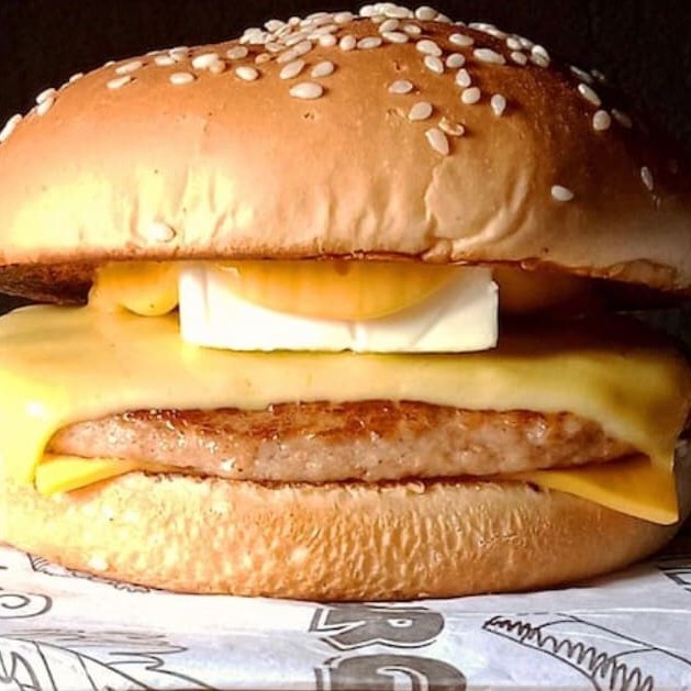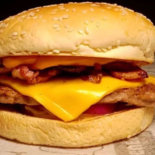 Pão, carne, queijo cheddar, cheddar cremoso e bacon