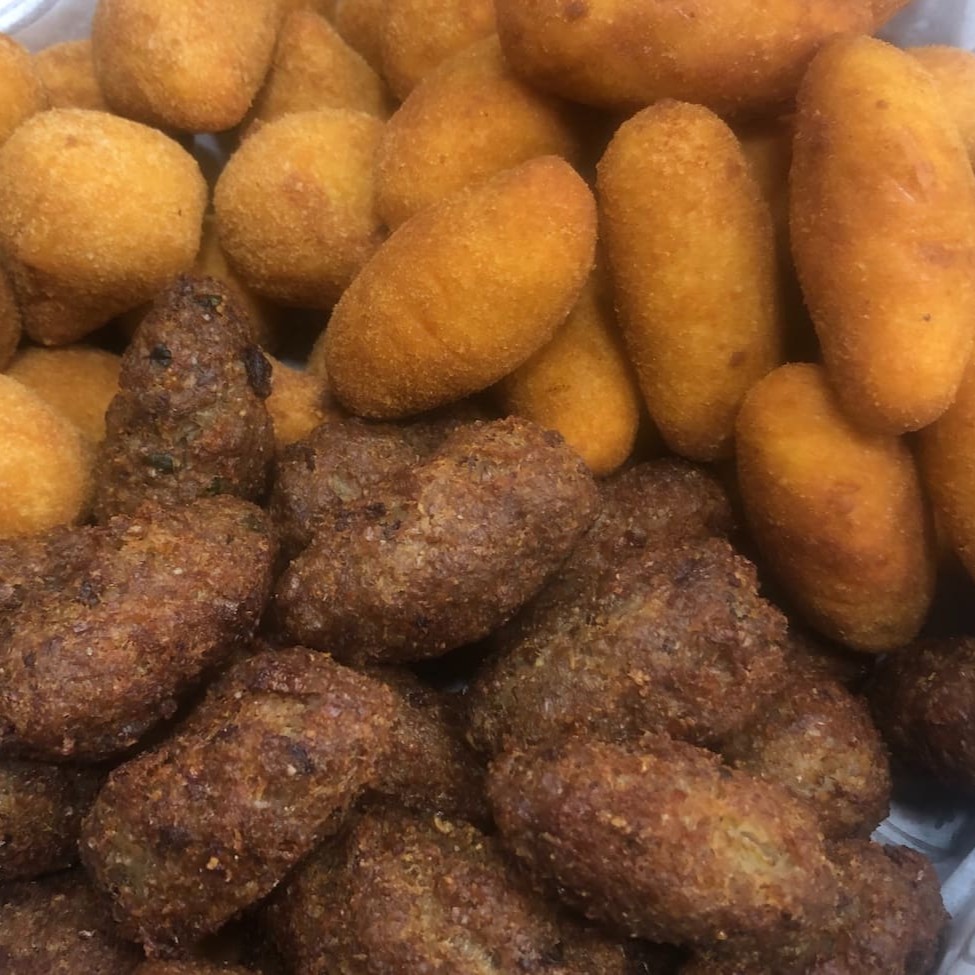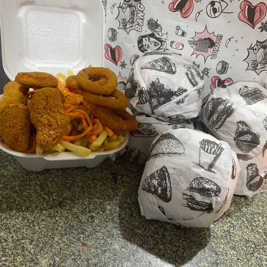 5 x-tudo(Pão, carne, queijo, ovo, queijo ,presunto, bacon, calabresa, alface, molho(maionese, ketchup) batata frita c cheddar, Nuggets, anel cebola Caixa 35cm