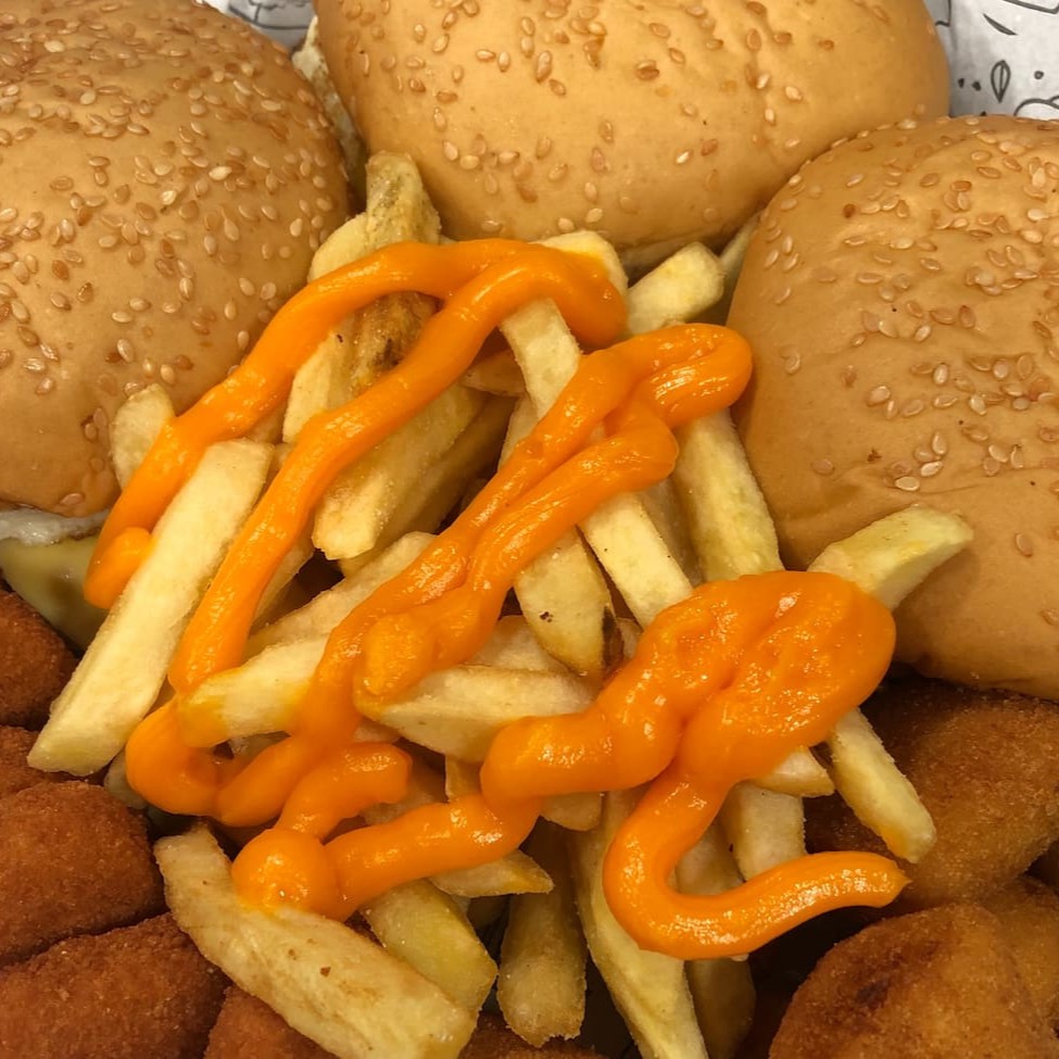 3x-Egg ( Pão, carne, queijo, alface, molho ( ketchup, maionese) batata frita c chedar, salgadinho e Nuggets 30cm