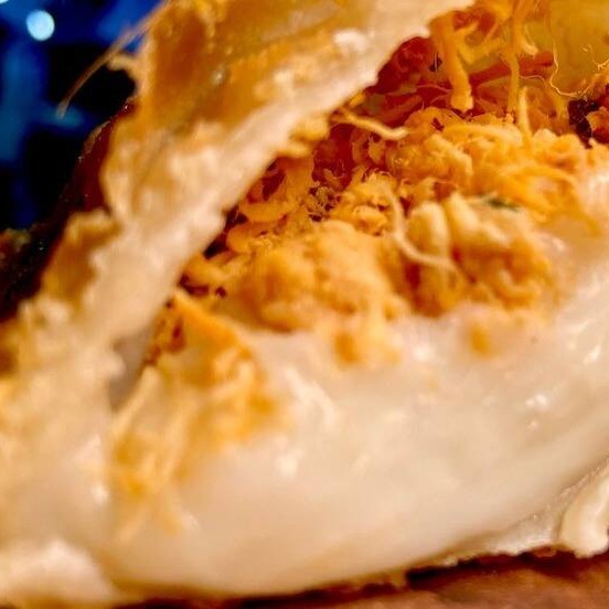 Queijo derretido e bacon bem dorado.