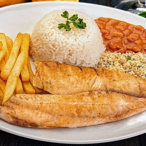 Acompanha feijão,farofa e fritas ( pode ser substituído por salada de legumes ou salada verde )