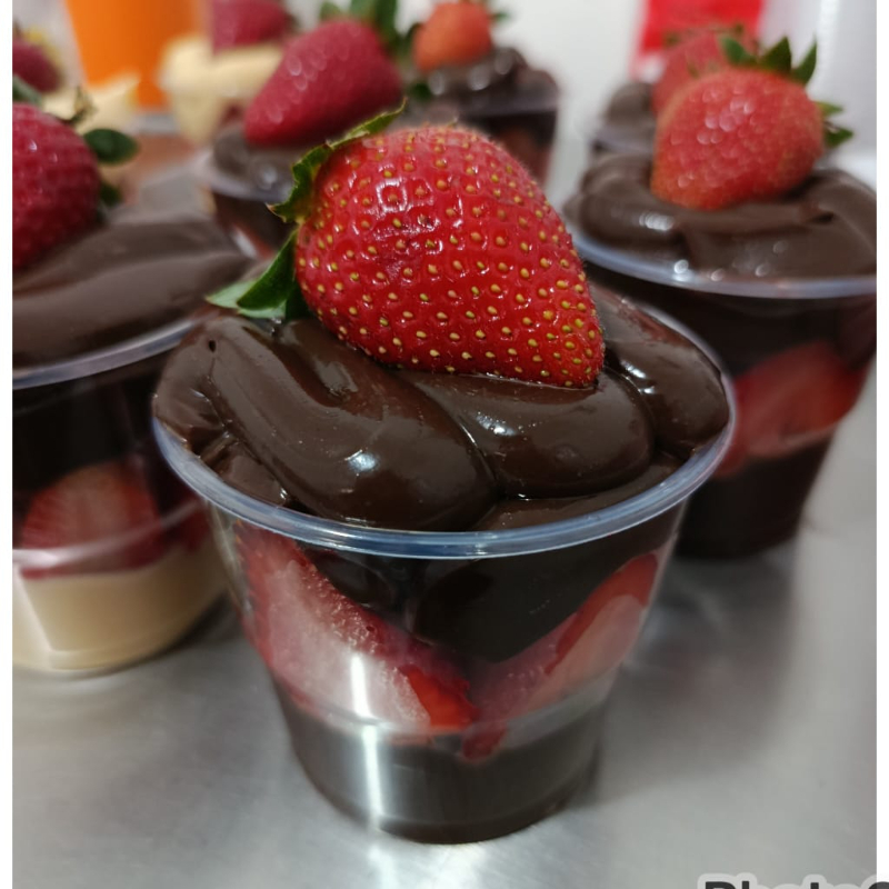Copo composto por Brigadeiro 50% + Brigadeiro de Leite Ninho + Brownie + Morango